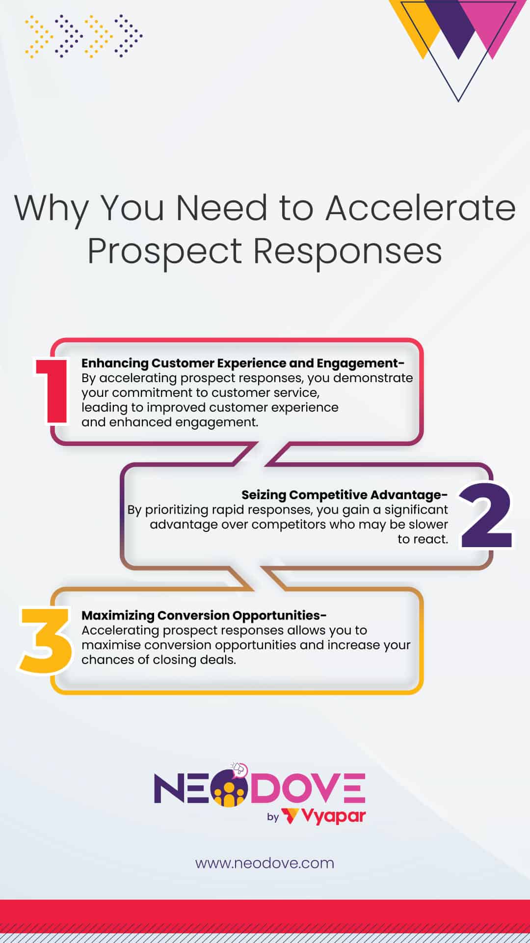 Prospects have a limited attention span and numerous options at their fingertips. Delayed responses increase the risk of losing their interest or capturing their attention at a time when they are no longer actively seeking solutions. Accelerating prospect responses allows you to strike while the iron is hot, maximizing conversion opportunities and increasing your chances of closing deals.